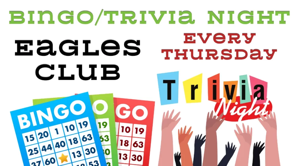 Bingo every Thursday at the Eagles Club in Columbus. Doors open at 4 pm. Games start at 7 pm, Food Counter opens at 5:30 p.m.